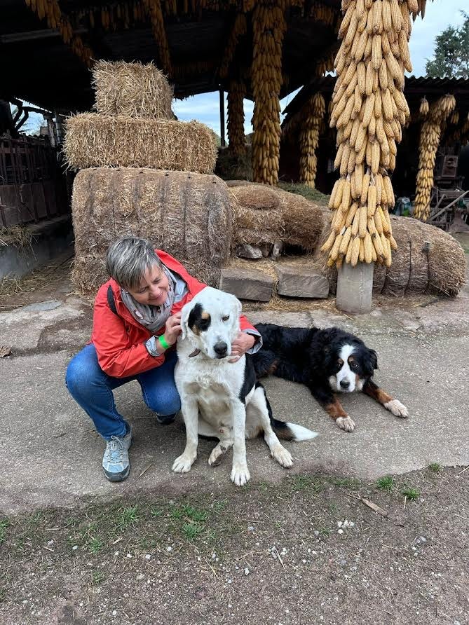 First— a stop at Mas Casablanca, a working farm for visitors (especially young ones; we saw lots of families). Two friendly large dogs guided us around for petting sheep, horses, goats, a donkey, baby cows and rabbits—along with some huge pigs that were not the sweet pink creatures Esteban envisioned (he’s got a soft spot for our porcine friends). Fortified by Bagel Coffee in Vic (yes, in Catalan countryside and gluten free and vegan options too), we had a delicious brunch and then continued on, the white-capped Pyrenees luring us onward.