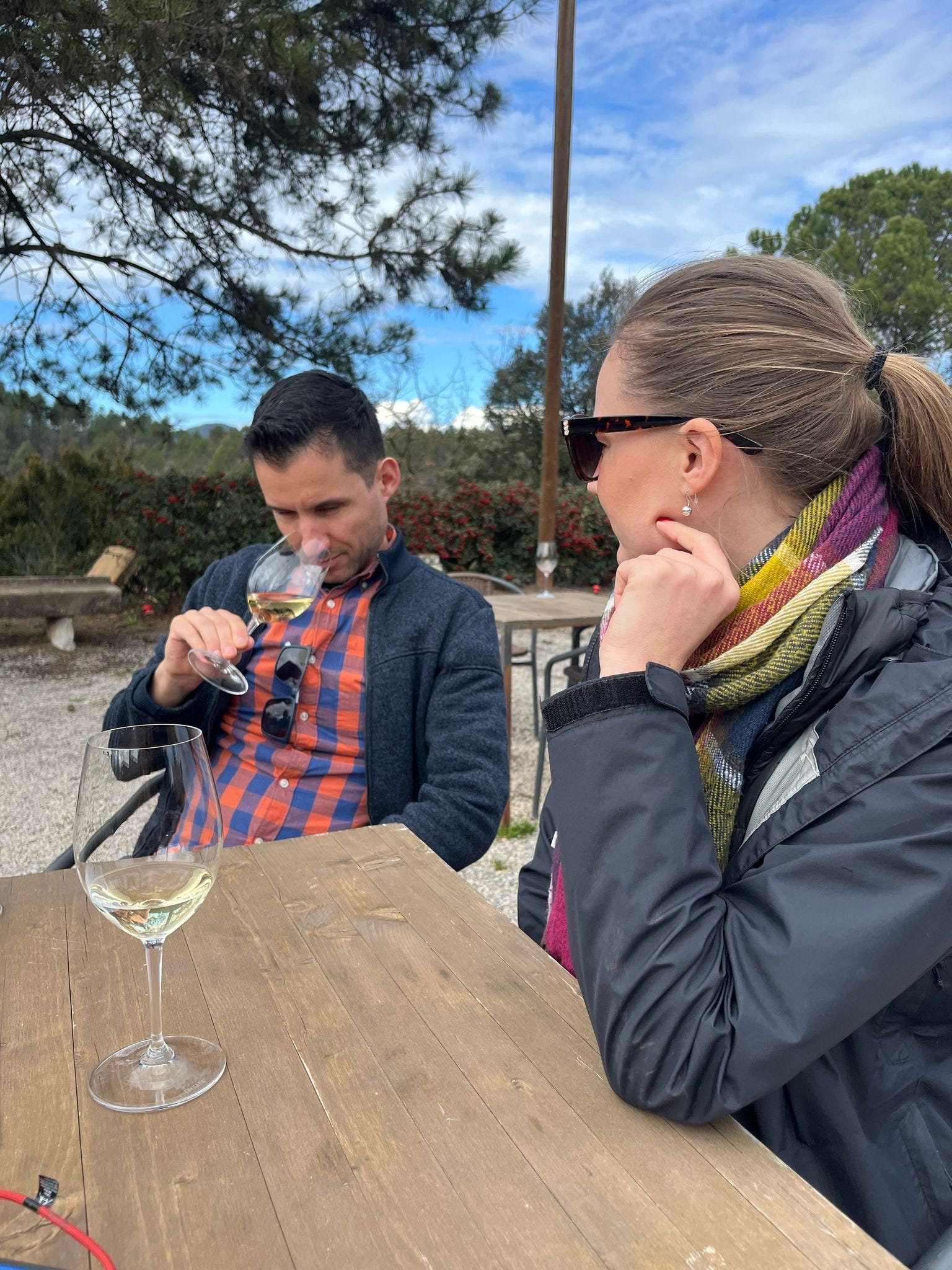 Second—the family-owned Abadal vineyard, in the Bages region, where wine has been made for over eight centuries. We drove up through vineyards in terraces surrounded by woods. Sitting in a sunny courtyard, Marielle, Sara and Esteban (who is a sommelier and winemaker) tried some traditional local varieties like Picapoll and Mandó grapes, impressed enough to bring an Abadal Picapoll home with them.
