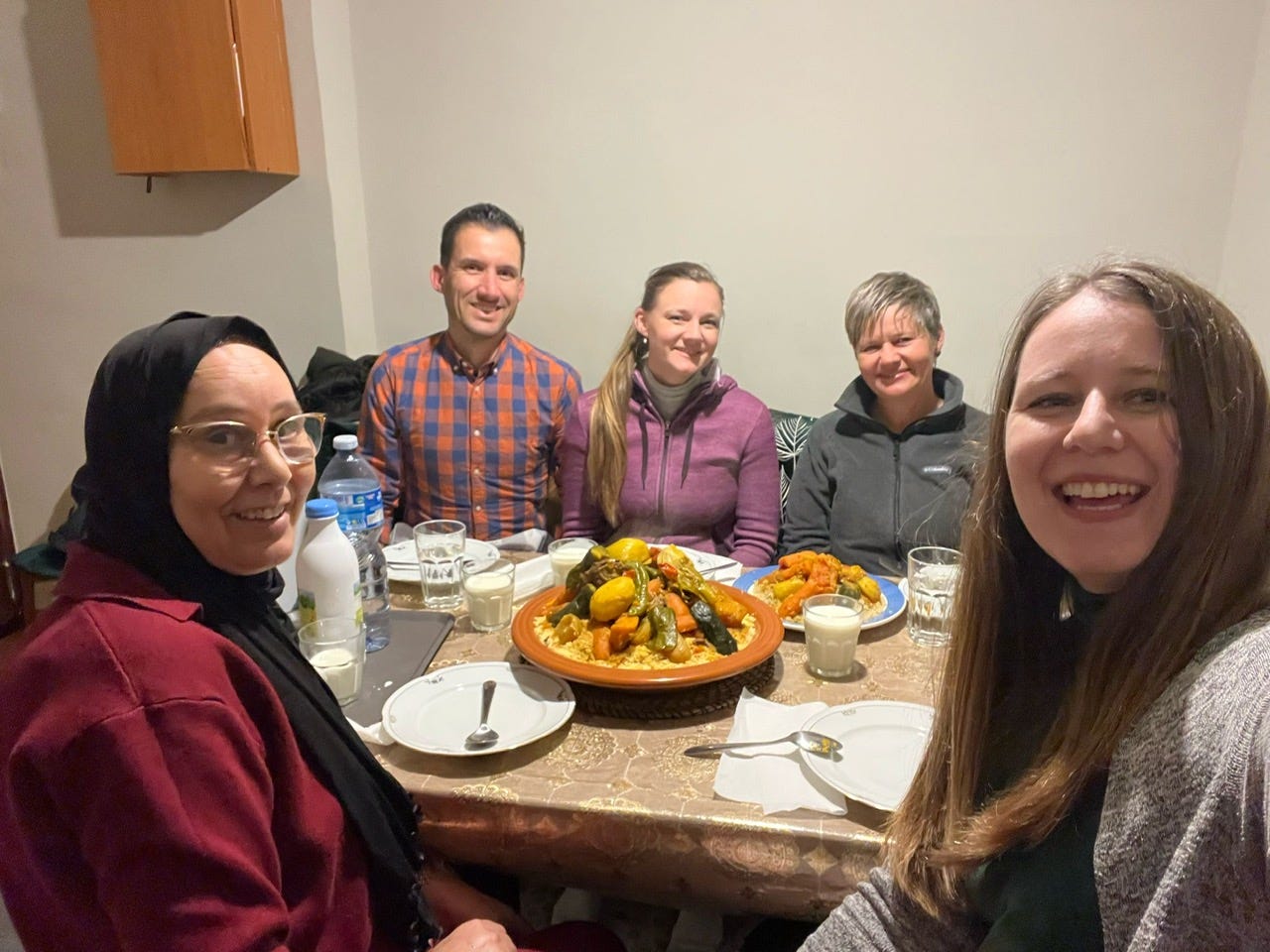 Fortunately, now that we are living in neighboring countries, Paris is a short flight (or a day’s train ride) away from Sara. I know that she and her Morrocan fiance Ilias will be here often because of his own mother living here in Barcelona, too. It is this rich cultural soup of our family life that I consider a rose in my life, too. Invited for traditional couscous at her future mother-in-law’s apartment, Sara, Marielle, Esteban and I communicated with Fatima in a mix of Spanish, French, English and Darija, the dialect of Arabic spoken in Morocco.