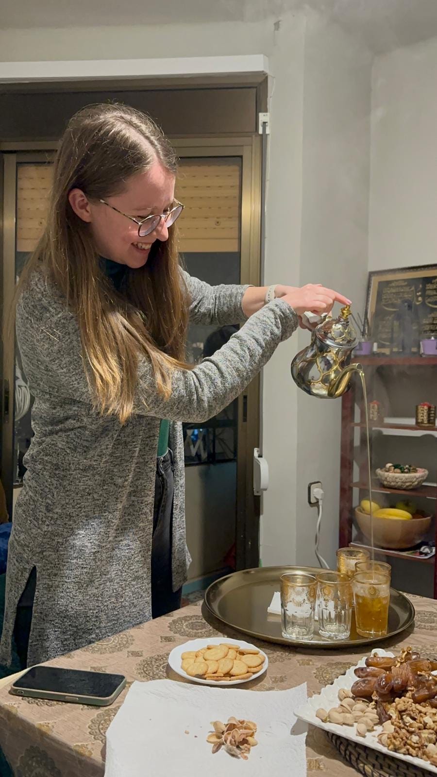 But the language of food and warmth and love required no translation as we heaped our plates full of Fatima’s wonderful cooking and hospitality. And Sara did the honors of pouring from an impressive height sweet hot mint tea from an elegant silver pitcher into our waiting glasses.